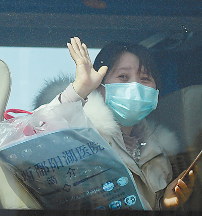 2月22日,江西中醫(yī)藥大學(xué)附屬醫(yī)院撫生院區(qū),11名此前由其他醫(yī)療機(jī)構(gòu)轉(zhuǎn)入該院的新冠肺炎患者治愈出院,其中有8人在該院接受了中醫(yī)治療,3人接受中西醫(yī)結(jié)合治療。圖為出院的病人向醫(yī)護(hù)人員揮手告別。時 雨攝(影像中國)