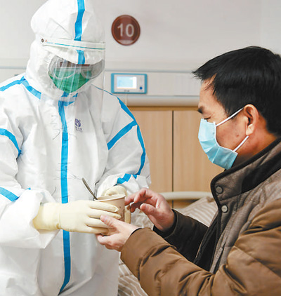 2月18日,在江西中醫(yī)藥大學(xué)附屬醫(yī)院撫生院區(qū)新冠肺炎患者的隔離病房內(nèi),護(hù)士將中藥湯劑端給患者。時 雨攝(影像中國)