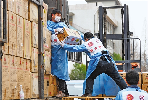 3月3日,武漢市青山區(qū)武糧倉(cāng)庫(kù),志愿者在搬運(yùn)捐贈(zèng)的水果等物資。記者 高興貴攝