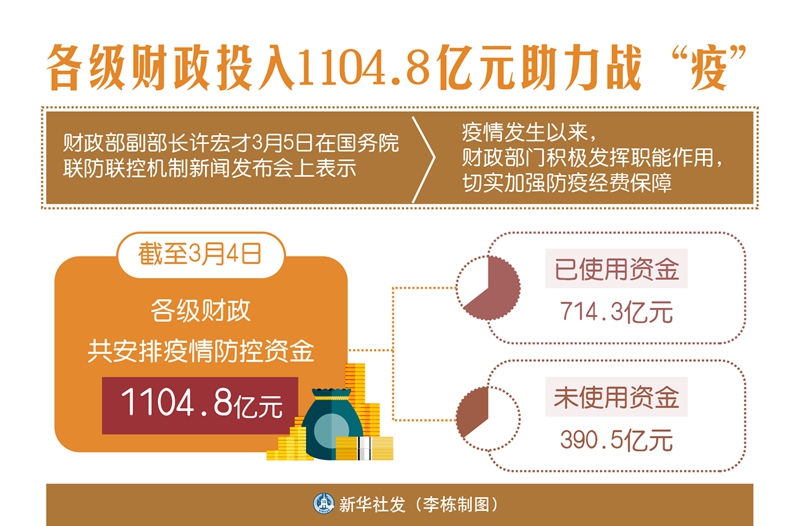 新華社北京3月5日電(記者申鋮、劉紅霞)財(cái)政部副部長(zhǎng)許宏才5日在國(guó)務(wù)院聯(lián)防聯(lián)控機(jī)制新聞發(fā)布會(huì)上表示,疫情發(fā)生以來(lái),財(cái)政部門積極發(fā)揮職能作用,切實(shí)加強(qiáng)防疫經(jīng)費(fèi)保障,截至3月4日,各級(jí)財(cái)政共安排疫情防控資金1104.8億元。