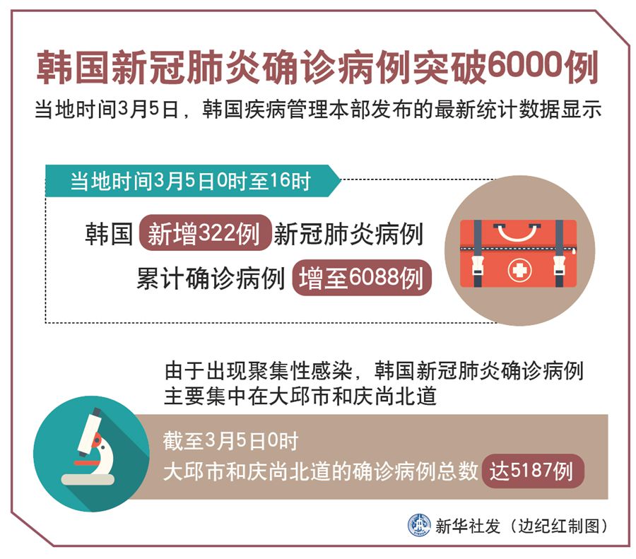 新華社首爾3月5日電(記者陸睿 耿學鵬)韓國疾病管理本部5日發(fā)布的最新統(tǒng)計數(shù)據(jù)顯示,當?shù)貢r間5日0時至16時,韓國新增322例新冠肺炎病例,累計確診病例增至6088例。