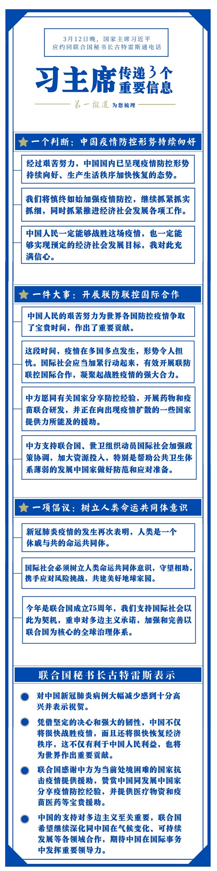 對疫情防控國際合作這件大事,習主席一直十分關心。此前,在內(nèi)外事活動中,他曾多次提及。這一次同古特雷斯通電話,習主席有更明確闡述。