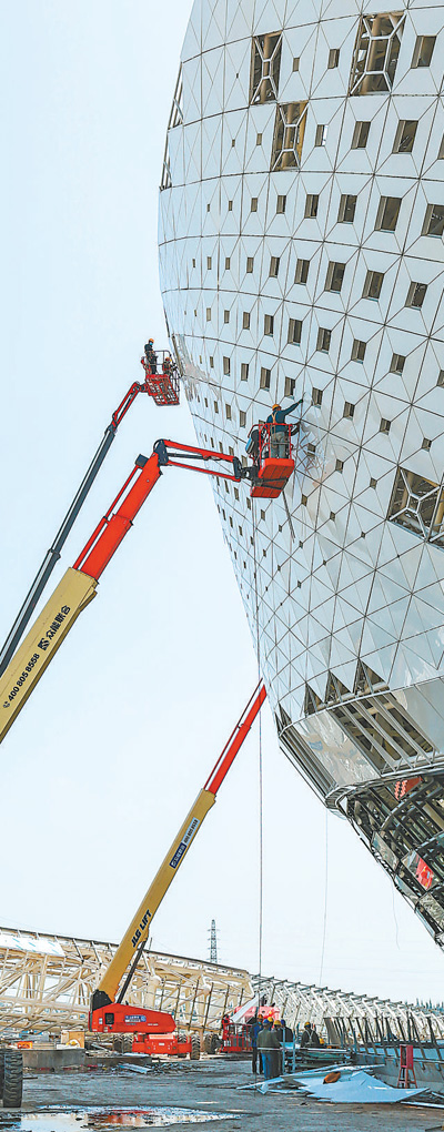 3月15日,第十八屆世界中學(xué)生運(yùn)動會主會場福建晉江市第二體育中心各個場館及室外工程均已全部復(fù)工。圖為工人在進(jìn)行主場館外立面施工。邵玉姿 董嚴(yán)軍攝影報道