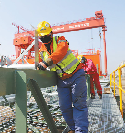 3月11日,在天津港大沽口港區(qū),工人正在加緊組裝海上油氣工程模塊。龔相娟 李宇光攝影報道