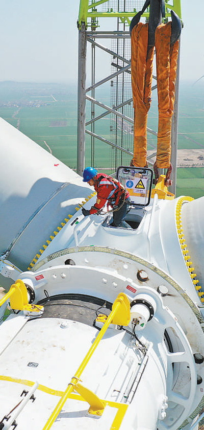 3月15日,在安徽省亳州市蒙城縣,華能風(fēng)電項目復(fù)工后的第七臺風(fēng)機(jī)順利吊裝。胡衛(wèi)國攝(影像中國)