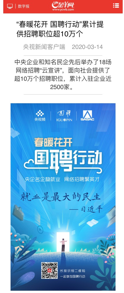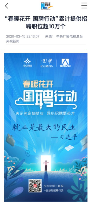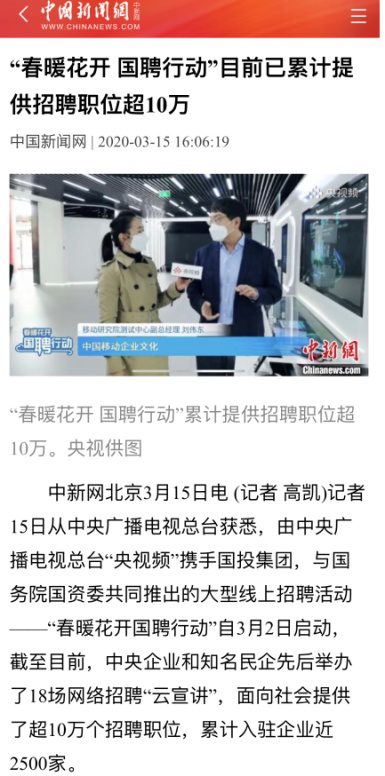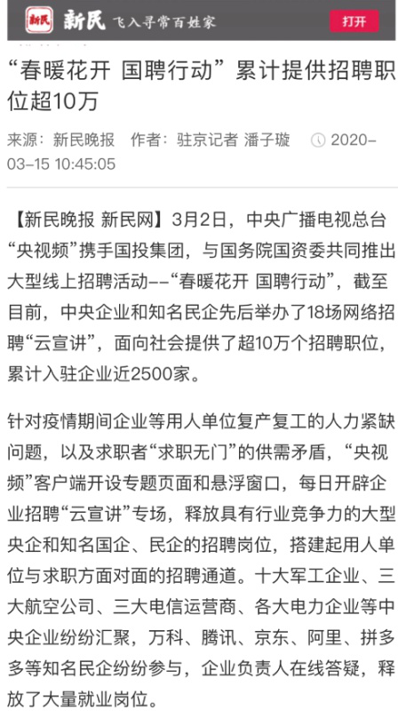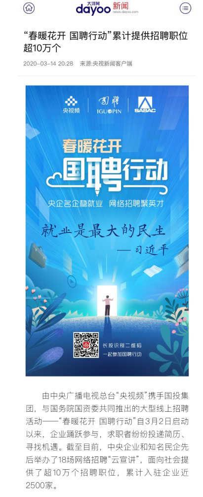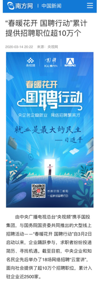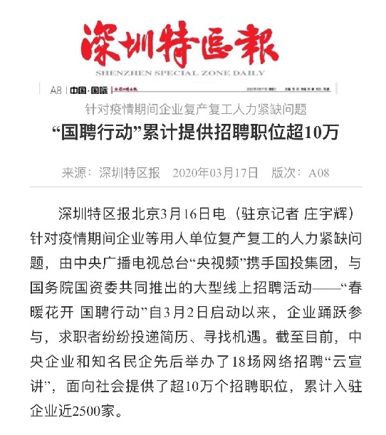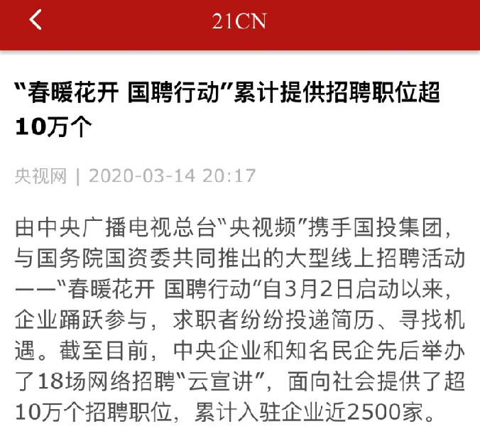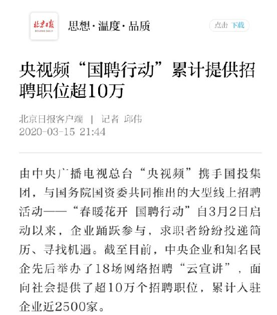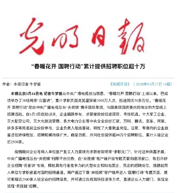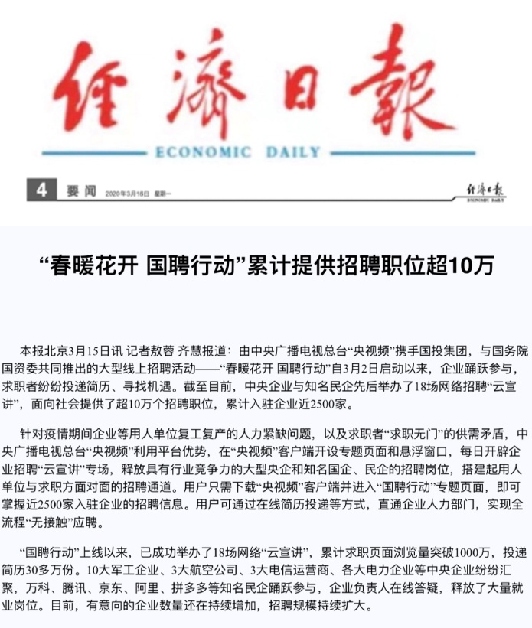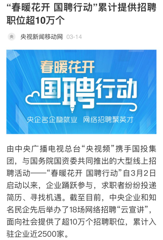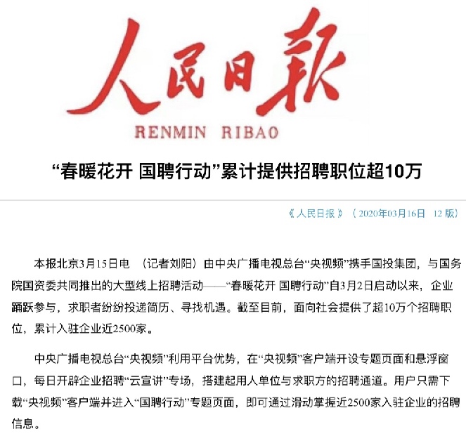 由中央廣播電視總臺“央視頻”攜手國投集團,與國務(wù)院國資委共同推出的大型線上招聘活動——“春暖花開 國聘行動”,自3月2日啟動以來,企業(yè)踴躍參與,求職者紛紛投遞簡歷。截至3月14日已面向社會提供了超10萬個招聘職位,累計入駐企業(yè)近2500家,引發(fā)眾多媒體和網(wǎng)站轉(zhuǎn)載報道。