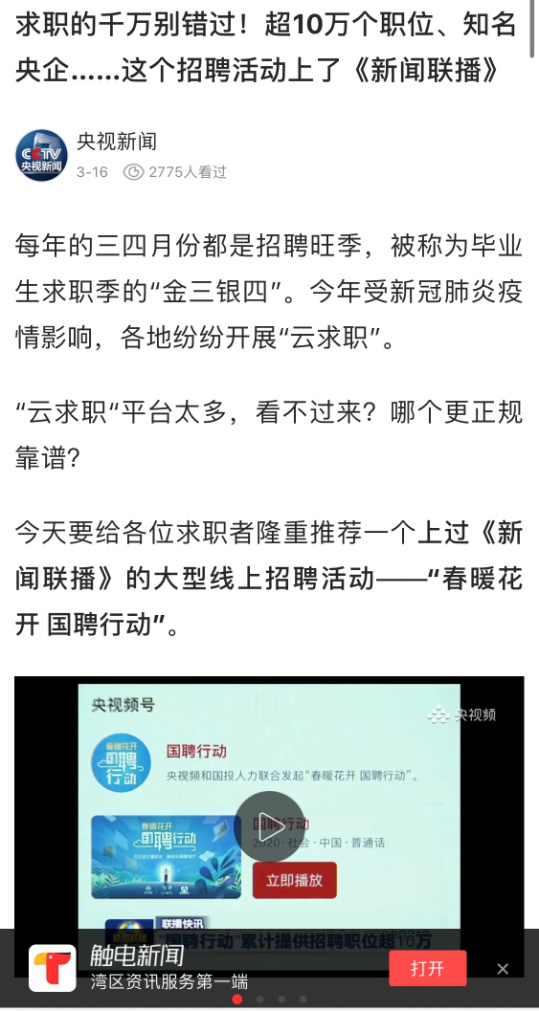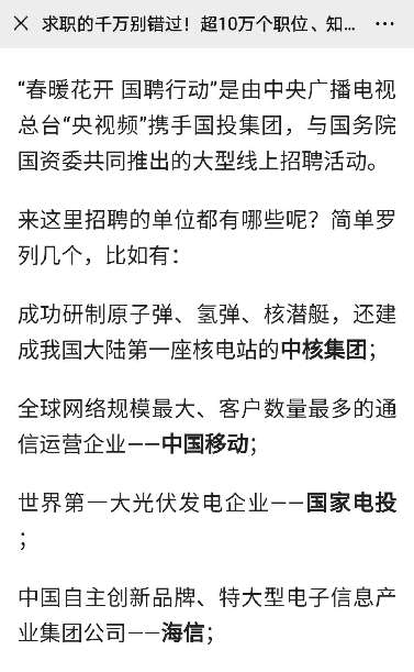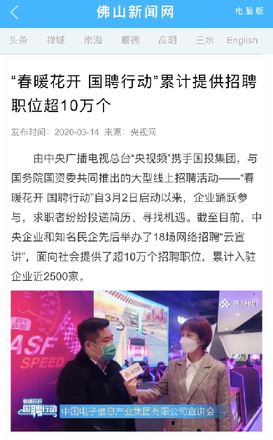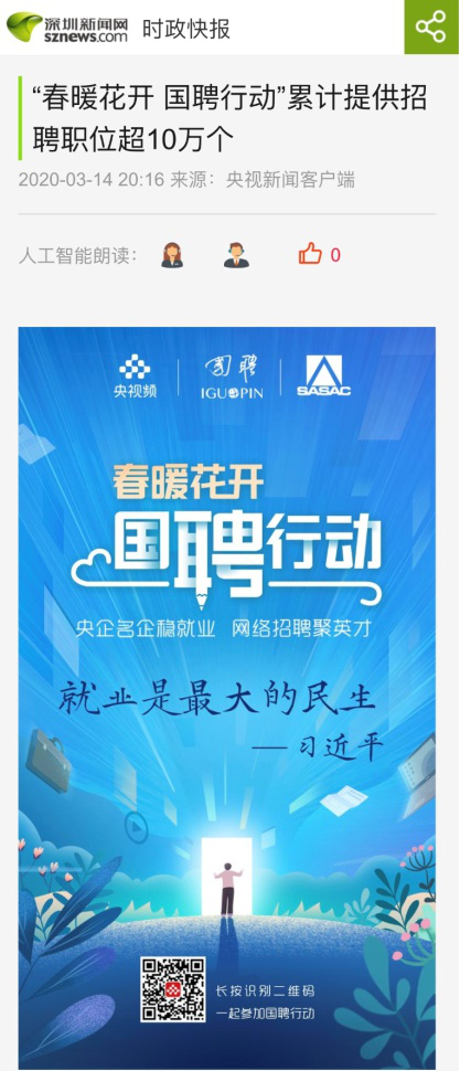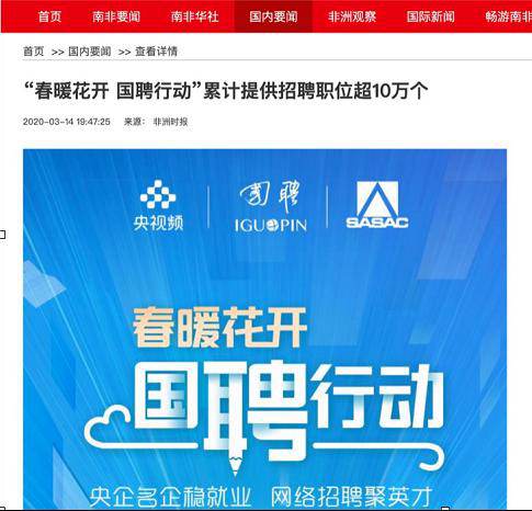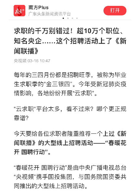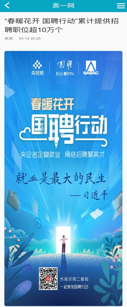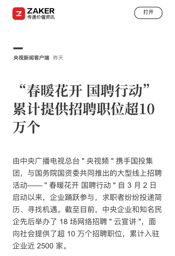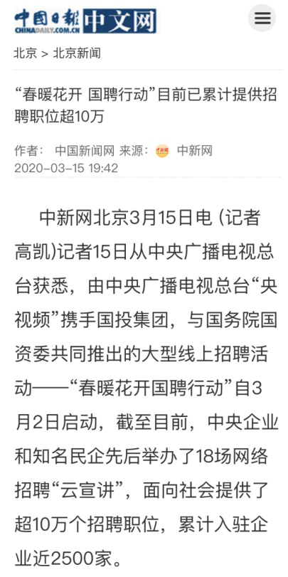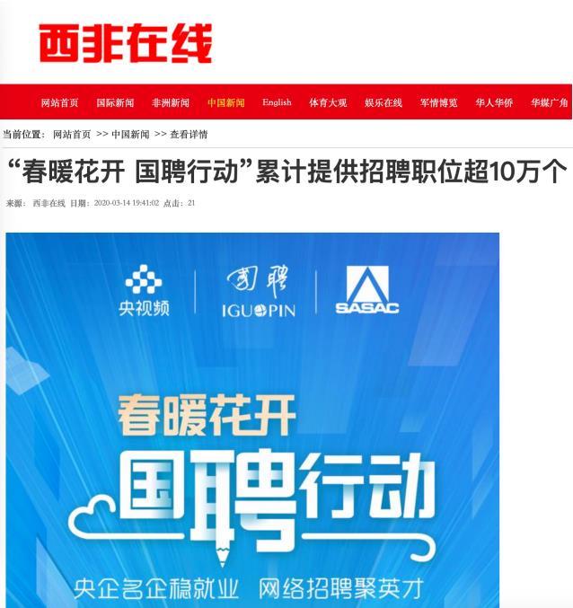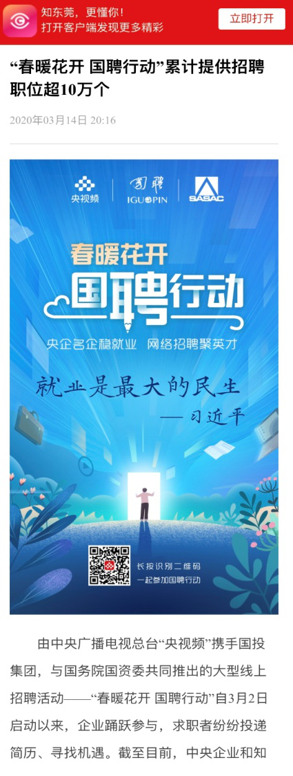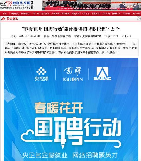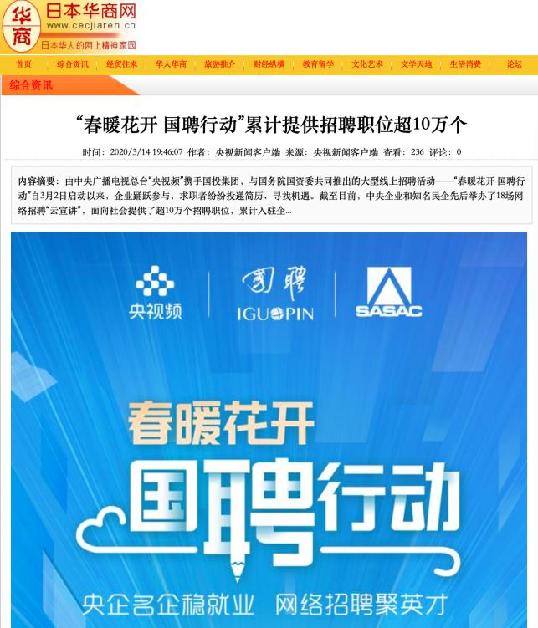 由中央廣播電視總臺“央視頻”攜手國投集團,與國務(wù)院國資委共同推出的大型線上招聘活動——“春暖花開 國聘行動”,自3月2日啟動以來,企業(yè)踴躍參與,求職者紛紛投遞簡歷。截至3月14日已面向社會提供了超10萬個招聘職位,累計入駐企業(yè)近2500家,引發(fā)眾多媒體和網(wǎng)站轉(zhuǎn)載報道。
