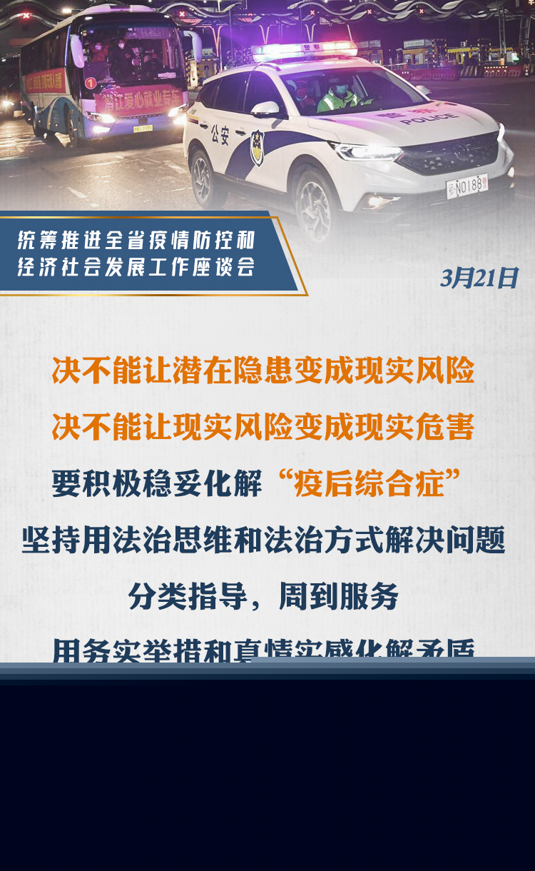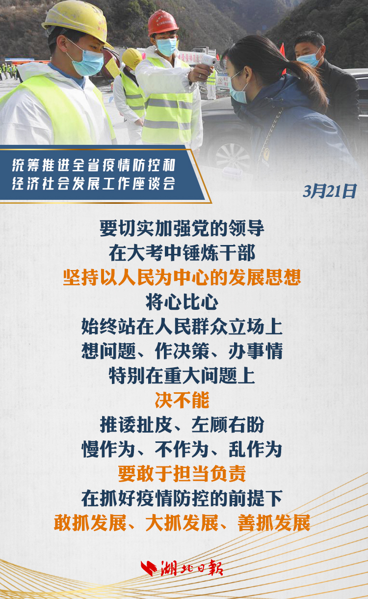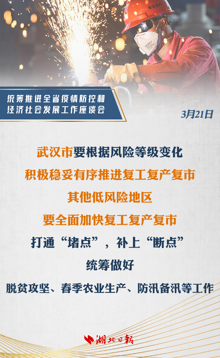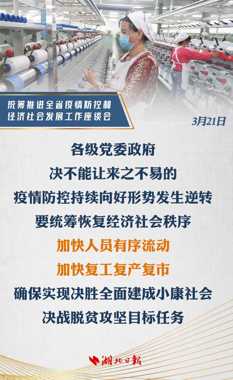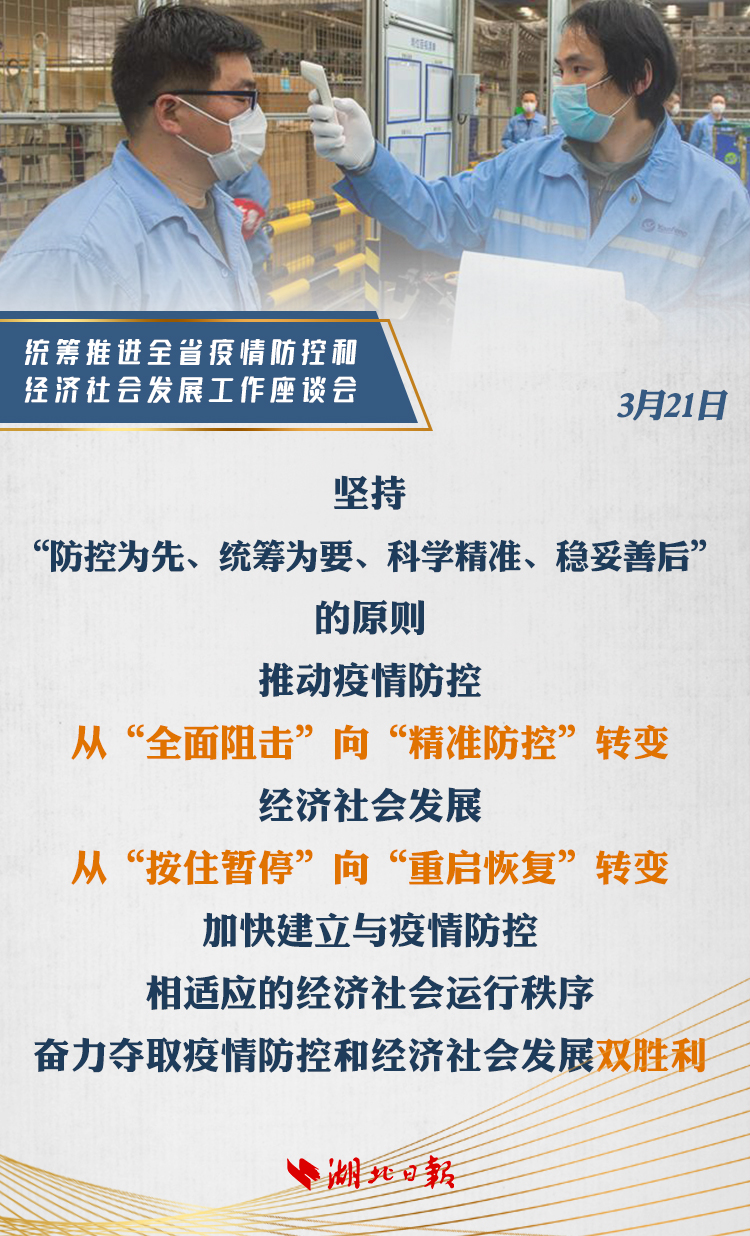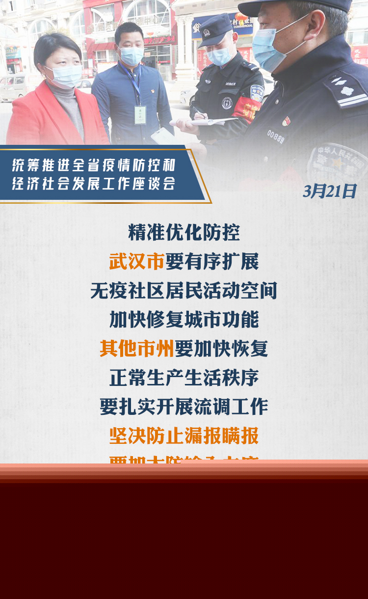 3月21日下午,湖北省在漢召開統(tǒng)籌推進(jìn)全省疫情防控和經(jīng)濟(jì)社會(huì)發(fā)展工作座談會(huì),學(xué)習(xí)貫徹習(xí)近平總書記關(guān)于疫情防控系列重要講話和重要指示批示精神,傳達(dá)省委常委會(huì)會(huì)議意見,研究部署統(tǒng)籌抓好全省疫情防控和經(jīng)濟(jì)社會(huì)發(fā)展重點(diǎn)工作。湖北省委書記、湖北省新冠肺炎疫情防控指揮部指揮長(zhǎng)應(yīng)勇出席會(huì)議并強(qiáng)調(diào):