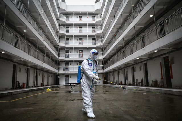 3月27日,武漢軟件工程職業(yè)學院康復(fù)驛站,工作人員在進行消殺。中青報·中青網(wǎng)記者 趙迪/攝