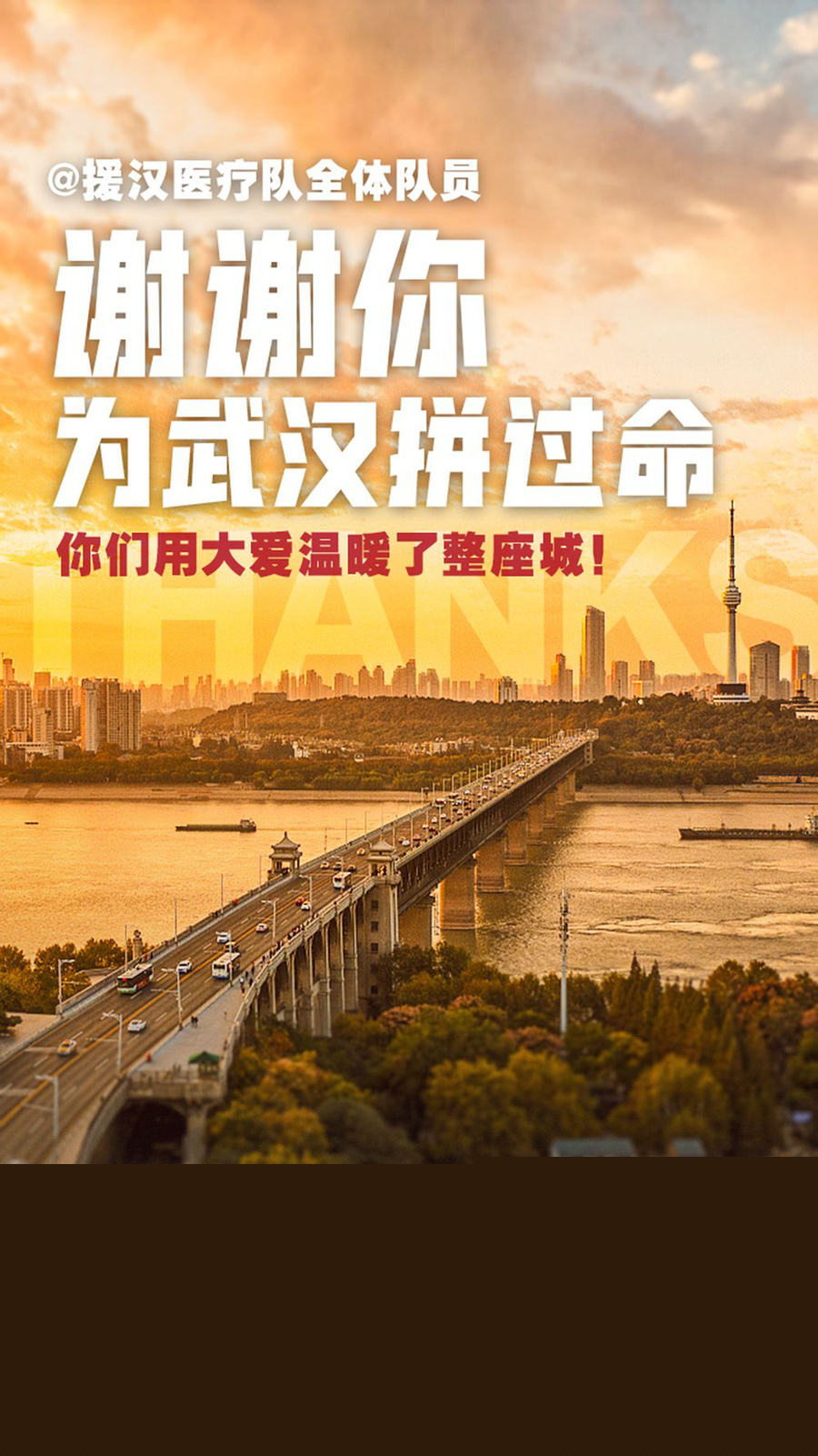 患難相扶,生死與共。在這幾十天里,你們與武漢人民心手相連、生死相依,從死神手中搶回了一條條生命、拯救了一個(gè)個(gè)家庭。忘不了你們從祖國(guó)四面八方馳援武漢時(shí),口中喊出的“武漢加油!中國(guó)加油!”;忘不了你們穿著防護(hù)裝備走進(jìn)病房,握著患者的手說(shuō)“別怕,有我們?cè)冢 ?;忘不了你們臉上被面罩勒出的一道道印痕;更忘不了你們摘掉口罩后露出美麗迷人的笑容!“沒(méi)有生而英勇,只是選擇無(wú)畏”,感謝你們?cè)谖錆h人民遭遇疫情的困難時(shí)刻,迎難而上、沖鋒在前,以命搏命、舍命相助,用大愛(ài)溫暖了整座城!因?yàn)槟銈兊牡絹?lái),武漢更多患者得到了及時(shí)有效的救治;因?yàn)槟銈兊牡絹?lái),武漢才這么快地迎來(lái)了疫情防控斗爭(zhēng)的勝利曙光;因?yàn)槟銈兊牡絹?lái),武漢才有了今天的穩(wěn)定和安寧。你們是最大的功臣!是新時(shí)代最可愛(ài)的人!武漢人民永遠(yuǎn)銘記你們的恩情!