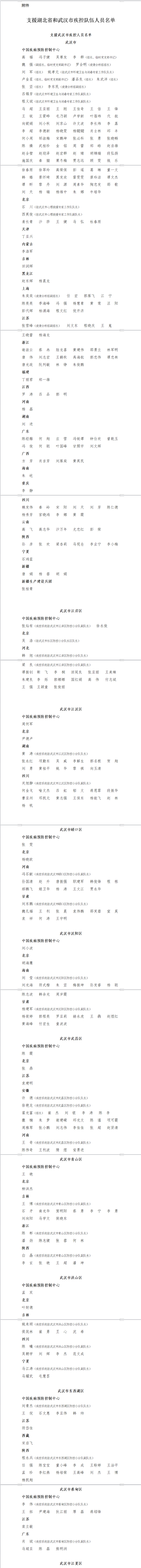 為做好一線人員關心關愛工作,鼓舞全系統(tǒng)士氣,現(xiàn)將支援湖北省和武漢市疾控隊伍人員名單印發(fā)給你們(詳見附件)。全國疾控系統(tǒng)要向逆行出征的援鄂、援漢防控隊員們學習,慎終如始,再接再厲、善作善成,堅決打贏疫情防控的人民戰(zhàn)爭、總體戰(zhàn)、阻擊戰(zhàn)。