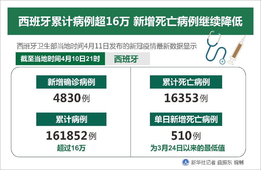 新華社馬德里4月11日電(謝宇智)西班牙衛(wèi)生部11日發(fā)布的新冠疫情最新數(shù)據(jù)顯示,截至當(dāng)?shù)貢r間10日21時,西班牙新增確診病例4830例,累計(jì)病例數(shù)超過16萬,達(dá)到161852例;累計(jì)死亡病例達(dá)16353例,單日新增死亡病例510例,為3月24日以來的最低值。