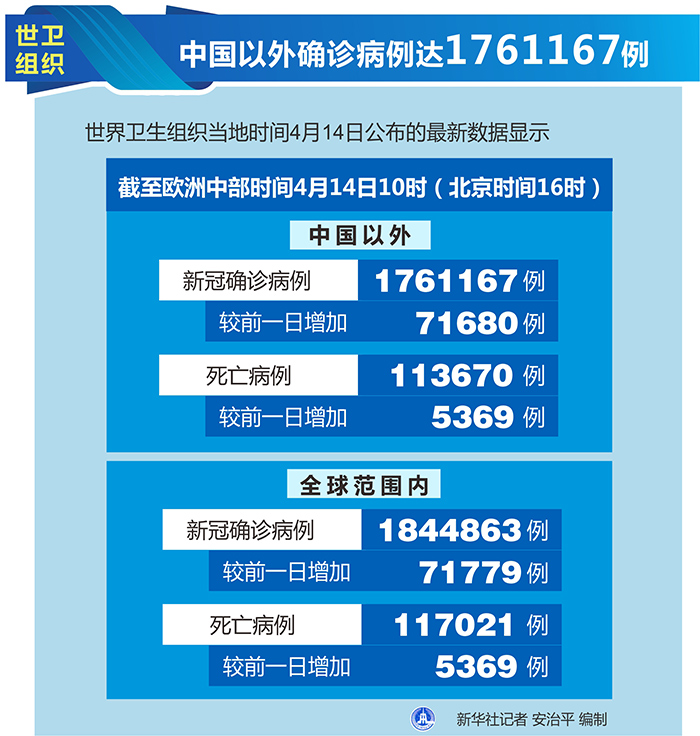 新華社日內(nèi)瓦4月14日電(記者劉曲)世界衛(wèi)生組織14日公布的最新數(shù)據(jù)顯示,中國以外新冠確診病例達到1761167例。