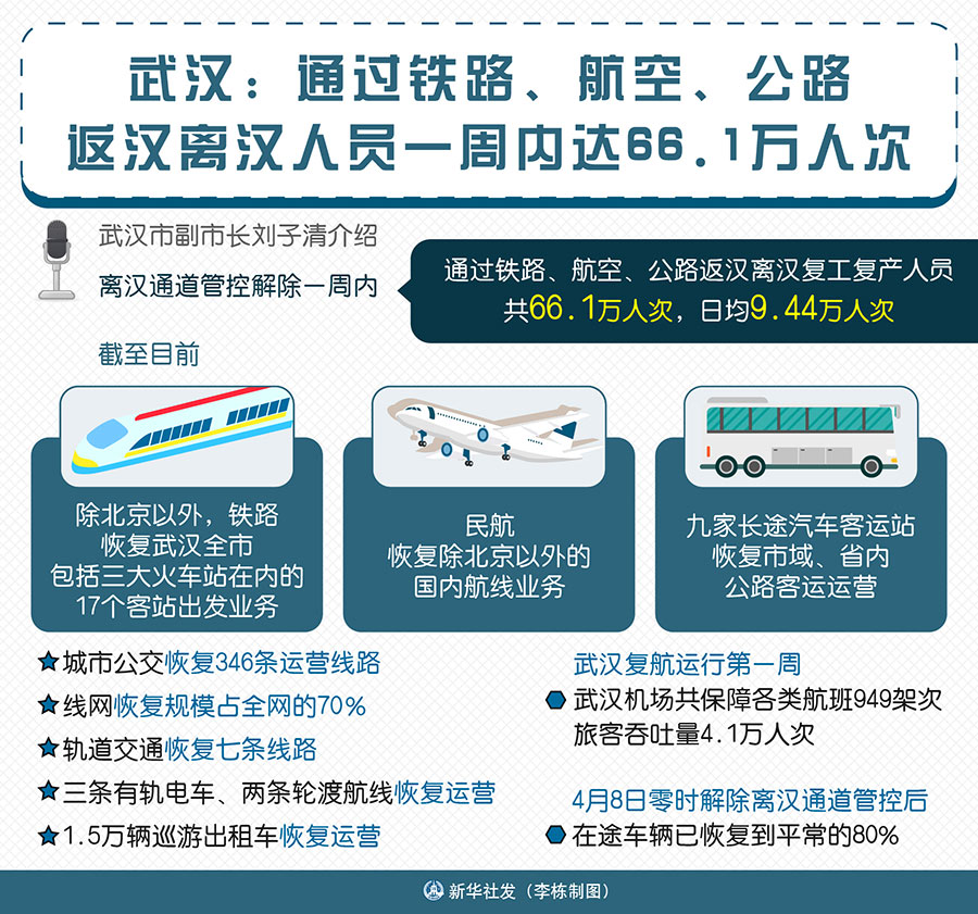 新華社武漢4月15日電(記者李偉、王作葵)武漢市副市長劉子清介紹,離漢通道管控解除一周內(nèi),通過鐵路、航空、公路返漢離漢復(fù)工復(fù)產(chǎn)人員共66.1萬人次,日均9.44萬人次。