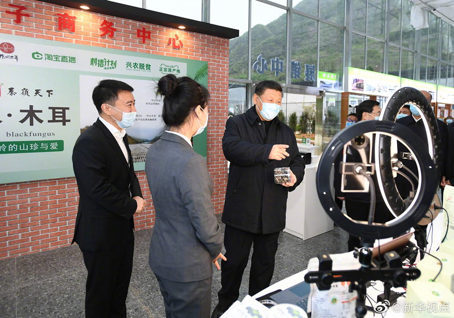 正在陜西考察的習(xí)近平總書記20日下午來到柞水縣小嶺鎮(zhèn)金米村。金米村地處秦嶺深處,近年來依靠發(fā)展木耳等產(chǎn)業(yè)擺脫了貧困。村培訓(xùn)中心,幾位村民正在做網(wǎng)上直播賣貨的準(zhǔn)備工作,總書記走到直播平臺前,同他們親切交談起來。他表示,電商作為新興業(yè)態(tài),既可以推銷農(nóng)副產(chǎn)品、幫助群眾脫貧致富,又可以推動鄉(xiāng)村振興,是大有可為的。(文字記者:張曉松 攝影記者:鞠鵬、謝環(huán)馳、燕雁、翟健嵐)