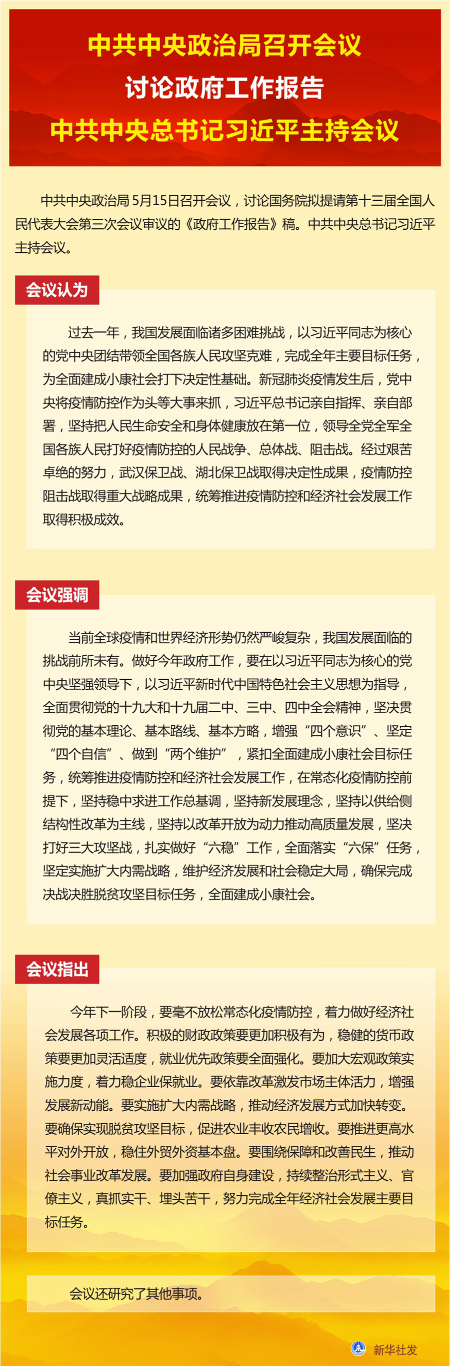 新華社北京5月15日電 中共中央政治局5月15日召開會議,討論國務(wù)院擬提請第十三屆全國人民代表大會第三次會議審議的《政府工作報(bào)告》稿。中共中央總書記習(xí)近平主持會議。