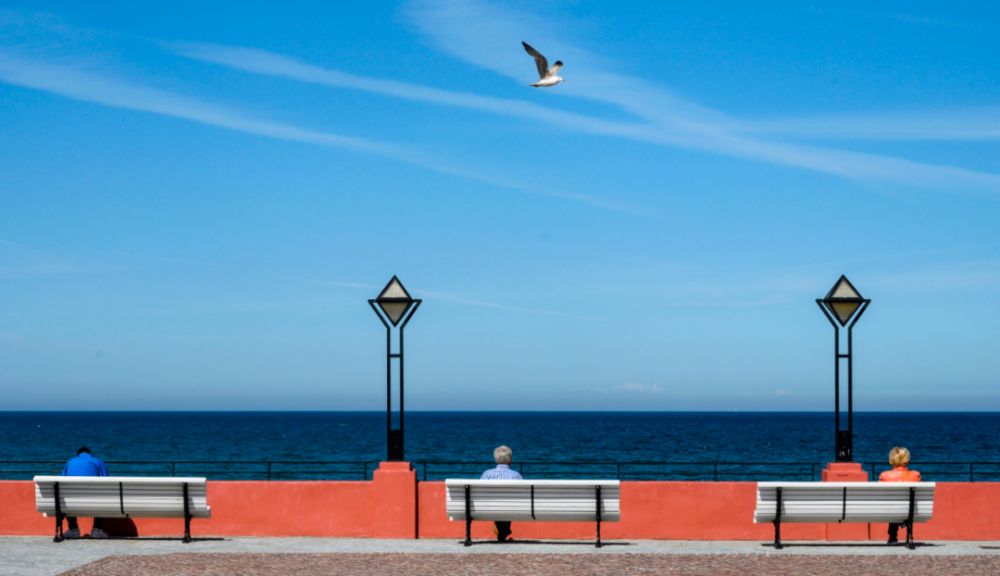 5月21日,在德國賓茨,人們坐在海邊的長椅上。歐洲地區(qū)新冠疫情持續(xù)緩解,多國已重新開放或計(jì)劃開放邊界,為即將到來的夏季旅游旺季創(chuàng)造條件。新華社/法新