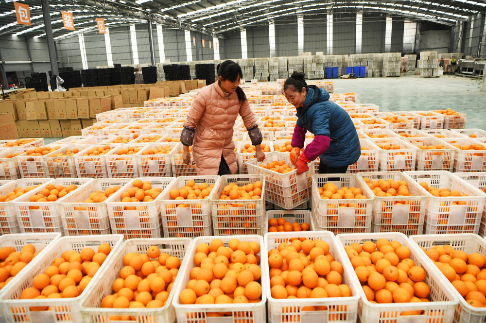 位于奉節(jié)縣白帝鎮(zhèn)的重慶橙楊生態(tài)農(nóng)業(yè)有限公司工作人員在臍橙分選包裝車間內(nèi)擺放臍橙(2019年2月13日攝)。新華社記者 王全超 攝