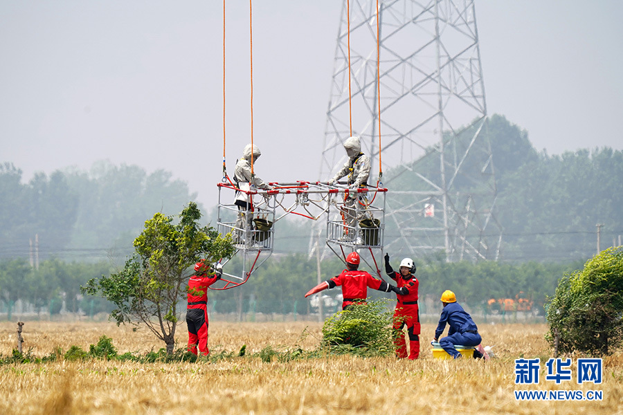 6月18日,直升機(jī)準(zhǔn)備用吊籃把兩名檢修人員“吊”到有缺陷的特高壓線路上。 新華社記者范世輝 攝(資料圖)