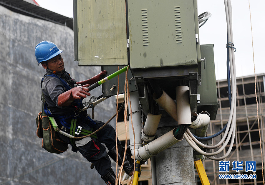 6月9日,在廣西桂林市永??h堡里鎮(zhèn),供電部門工作人員在搶修損壞的供電設(shè)備。? 新華社記者 陸波岸 攝(資料圖)