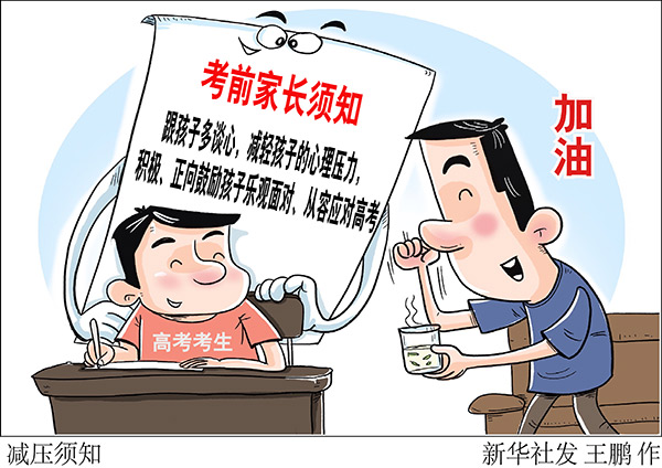 在緩解考生心理壓力上,關(guān)鍵提示提醒家長考前要按照高考的時間安排調(diào)整孩子作息,根據(jù)孩子的身體素質(zhì),選擇適合的運動項目和方式稍作放松,高考期間不可運動過量。同時,家長要關(guān)注孩子的心理狀態(tài),營造溫馨、放松的家庭氛圍??梢愿⒆佣嗾勑?,減輕孩子的心理壓力,積極、正向鼓勵孩子樂觀面對、從容應(yīng)對高考。