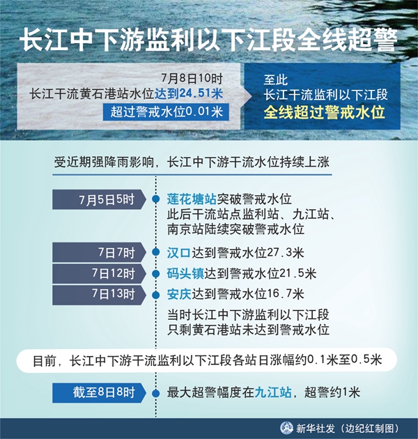 新華社武漢7月8日電(記者李思遠(yuǎn)、樂文婉)8日10時(shí),長(zhǎng)江干流黃石港站水位達(dá)到24.51米,超過警戒水位0.01米。至此,長(zhǎng)江干流監(jiān)利以下江段全線超過警戒水位。