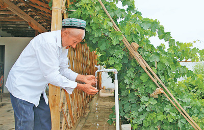 伊米提·艾山擰開院子里的水龍頭洗手。記者 李亞楠攝