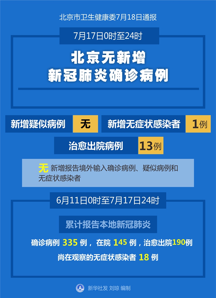 6月11日0時(shí)至7月17日24時(shí),北京市累計(jì)報(bào)告本地新冠肺炎確診病例335例,在院145例,治愈出院190例,尚在觀察的無癥狀感染者18例。