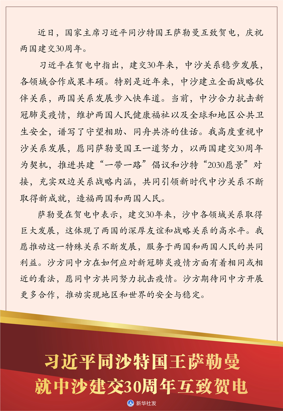 習近平在賀電中指出,建交30年來,中沙關系穩(wěn)步發(fā)展,各領域合作成果豐碩。特別是近年來,中沙建立全面戰(zhàn)略伙伴關系,兩國關系發(fā)展步入快車道。當前,中沙合力抗擊新冠肺炎疫情,維護兩國人民健康福祉以及全球和地區(qū)公共衛(wèi)生安全,譜寫了守望相助、同舟共濟的佳話。我高度重視中沙關系發(fā)展,愿同薩勒曼國王一道努力,以兩國建交30周年為契機,推進共建“一帶一路”倡議和沙特“2030愿景”對接,充實雙邊關系戰(zhàn)略內涵,共同引領新時代中沙關系不斷取得新成就,造福兩國和兩國人民。
