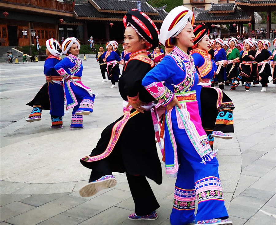 貴州省晴隆縣阿妹戚托藝術(shù)團(tuán)團(tuán)長(zhǎng)文安梅(前左)在領(lǐng)舞(6月9日攝)。新華社記者 齊健 攝