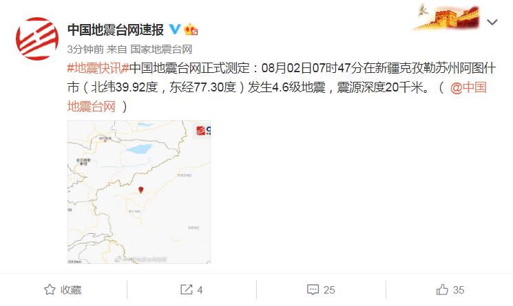 中國地震臺(tái)網(wǎng)正式測定:08月02日07時(shí)47分在新疆克孜勒蘇州阿圖什市(北緯39.92度,東經(jīng)77.30度)發(fā)生4.6級(jí)地震,震源深度20千米。
