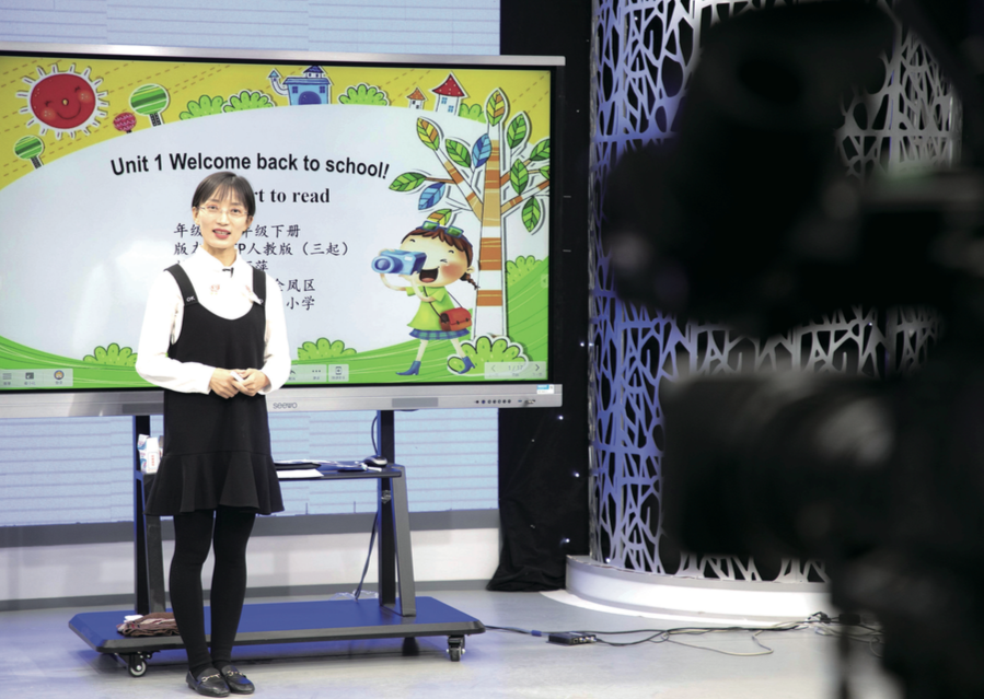 2月17日,寧夏銀川市金鳳區(qū)實(shí)驗(yàn)小學(xué)教師楊玉燕在錄制“空中課堂”四年級(jí)英語(yǔ)課程(楊植森/攝)