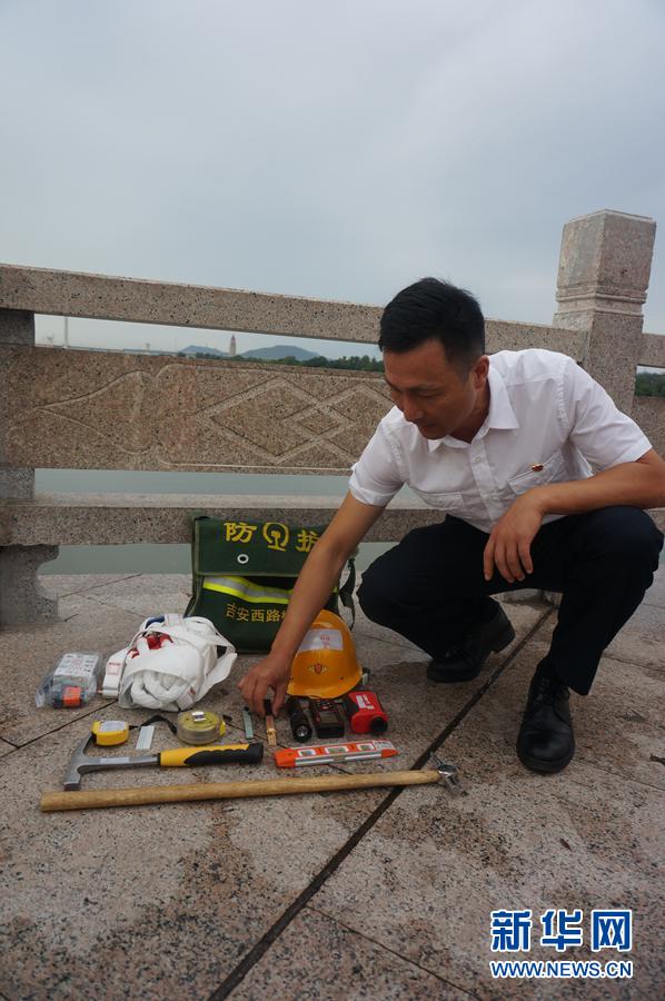 8月19日,路橋專業(yè)工程師張宏斌介紹工具袋里的檢修工具。新華網記者劉瓊 攝