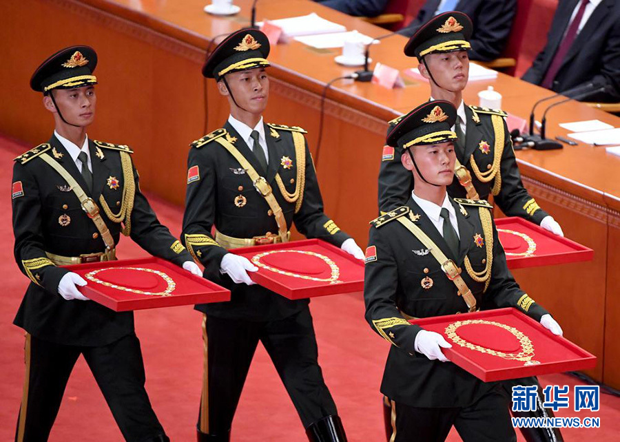 9月8日上午,全國抗擊新冠肺炎疫情表彰大會上,4名禮兵手捧共和國勛章、國家榮譽稱號獎?wù)?,行進到儀式現(xiàn)場。新華社記者 岳月偉 攝