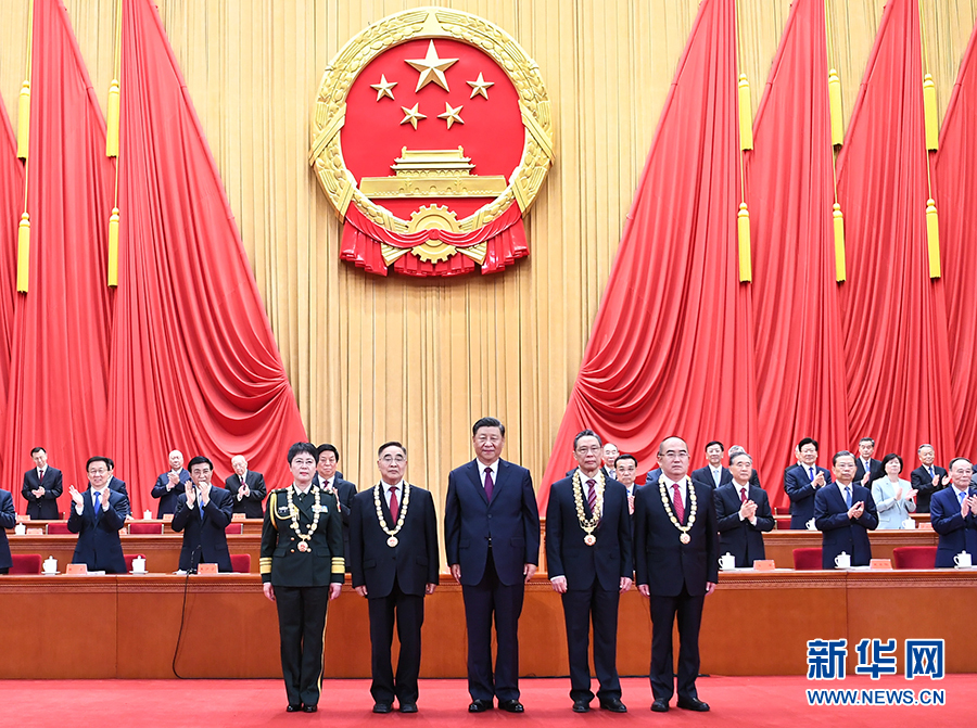 9月8日,全國抗擊新冠肺炎疫情表彰大會在北京人民大會堂隆重舉行。中共中央總書記、國家主席、中央軍委主席習(xí)近平向“共和國勛章”獲得者鐘南山(前排右二),“人民英雄”國家榮譽稱號獲得者張伯禮(前排左二)、張定宇(前排右一)、陳薇(前排左一)頒授勛章獎?wù)隆?新華社記者 謝環(huán)馳 攝