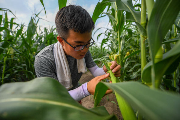 在吉林省梨樹縣四棵樹鄉(xiāng)三棵樹村的“科技小院”試驗田,中國農(nóng)業(yè)大學(xué)在讀碩士沙野查看玉米長勢(2019年7月24日攝)。新華社記者 張楠 攝?
