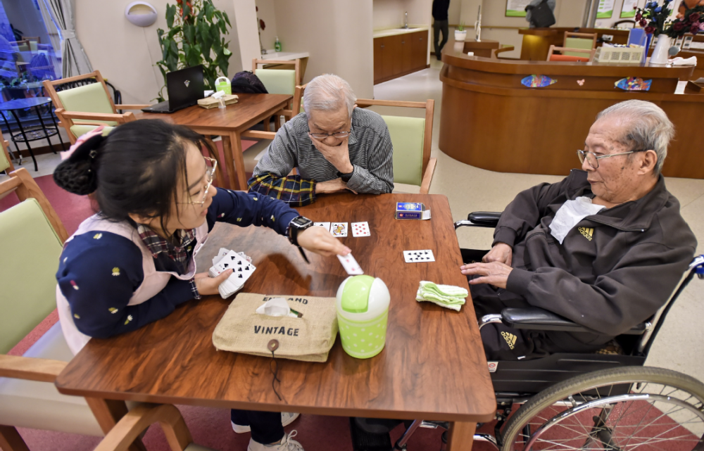 北京市豐臺區(qū)新村街道社區(qū)養(yǎng)老中心的工作人員在陪老人做游戲(李欣/ 攝)