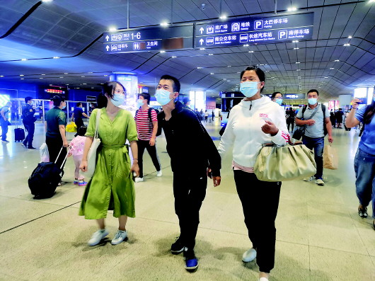 王唯佳(中)到達(dá)天津火車站,在輔導(dǎo)員高雨桐(左)和家人陪伴下走向南開大學(xué)校車。本報記者白佳麗攝