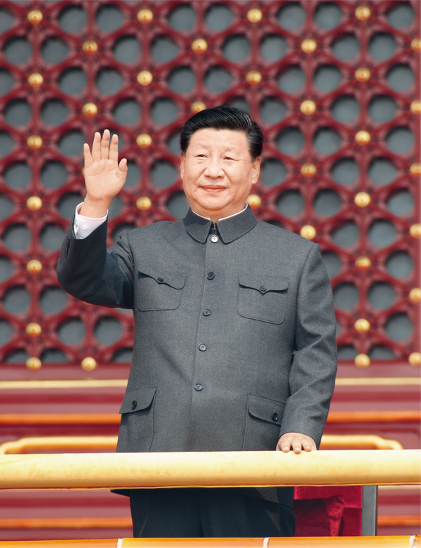 2019年10月1日,慶祝中華人民共和國成立70周年大會在北京天安門廣場隆重舉行。中共中央總書記、國家主席、中央軍委主席習(xí)近平發(fā)表重要講話并檢閱受閱部隊。這是習(xí)近平在天安門城樓上。 新華社記者 黃敬文/攝