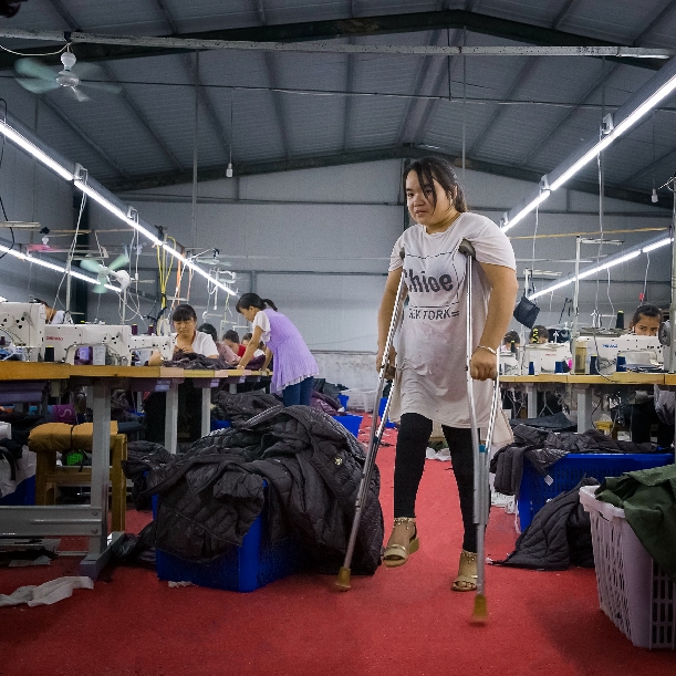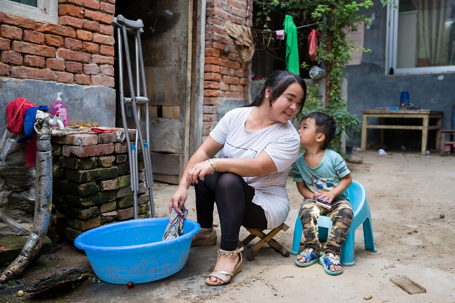 在呂陵鎮(zhèn)還有這么一個(gè)村民,黃菲菲,患有小兒麻痹,家有老人需要贍養(yǎng),還有個(gè)2歲多的孩子,丈夫也常年不在家。雖然她是貧困戶,生活負(fù)擔(dān)這么大,但磨難壓不倒堅(jiān)強(qiáng)的她。為了讓孩子以后能生活地更好些,她來到扶貧車間打工。(楊科 攝)
