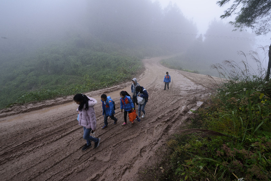 交通運輸條件落后是重慶市貧困山區(qū)脫貧發(fā)展的制約短板。圖為重慶市綦江區(qū)橫山鎮(zhèn)水云軒小學生踩著泥濘道路上學場景。(楊奇 攝)