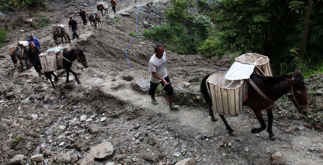 交通運輸難問題突出,肩挑背磨和牲畜托運是貧困山區(qū)物資運輸的主要方式。圖為重慶市黔江區(qū)貧困鄉(xiāng)村馬幫運輸農用物資場景。(楊敏 攝)