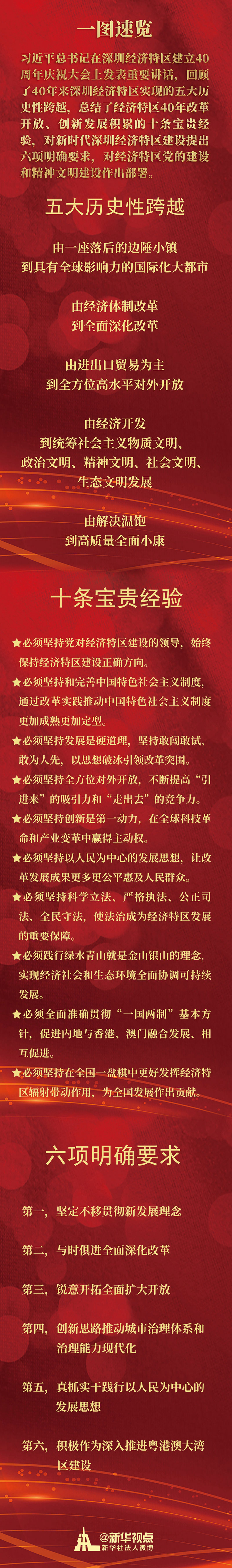 習(xí)近平總書記在深圳經(jīng)濟(jì)特區(qū)建立40周年慶祝大會上發(fā)表重要講話,回顧了40年來深圳經(jīng)濟(jì)特區(qū)實(shí)現(xiàn)的五大歷史性跨越,總結(jié)了經(jīng)濟(jì)特區(qū)40年改革開放、創(chuàng)新發(fā)展積累的十條寶貴經(jīng)驗(yàn),對新時代深圳經(jīng)濟(jì)特區(qū)建設(shè)提出六項(xiàng)明確要求,對經(jīng)濟(jì)特區(qū)黨的建設(shè)和精神文明建設(shè)作出部署。