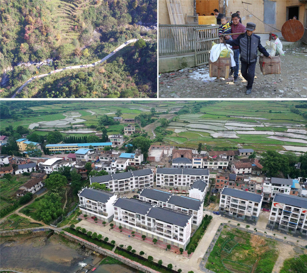 拼版照片的上左圖:在江西省修水縣上奉鎮(zhèn)麻洞村,村民胡尚海一家和鄰居們在乘車搬離大山溝(2017年11月攝,資料照片)。