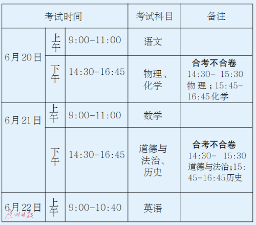答:《廣州市教育局關(guān)于進(jìn)一步深化高中階段學(xué)校考試招生制度改革的實施意見》(穗教規(guī)字〔2018〕8號)規(guī)定,物理和化學(xué)、道德與法治和歷史科目考試實行“合考不合卷”。合考的兩個學(xué)科安排在同一場次依次進(jìn)行考試,試卷分開收發(fā),兩科考試中間安排15分鐘時間收發(fā)試卷,期間考生原則上不得離開考場。
