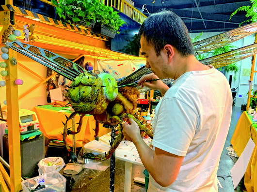 為了給人們解釋蜻蜓如何飛行覓食,寧原制作了一個(gè)放大數(shù)萬(wàn)倍的彩色巨型“蜻蜓隊(duì)長(zhǎng)”模型;為了展示蜘蛛織網(wǎng)的過(guò)程,他不僅制作了一個(gè)龐大的金色蜘蛛,還搭建了紙質(zhì)樹林立體展板,還原小蜘蛛在樹林中織網(wǎng)的場(chǎng)景,讓觀眾看完恍然大悟、大呼過(guò)癮。