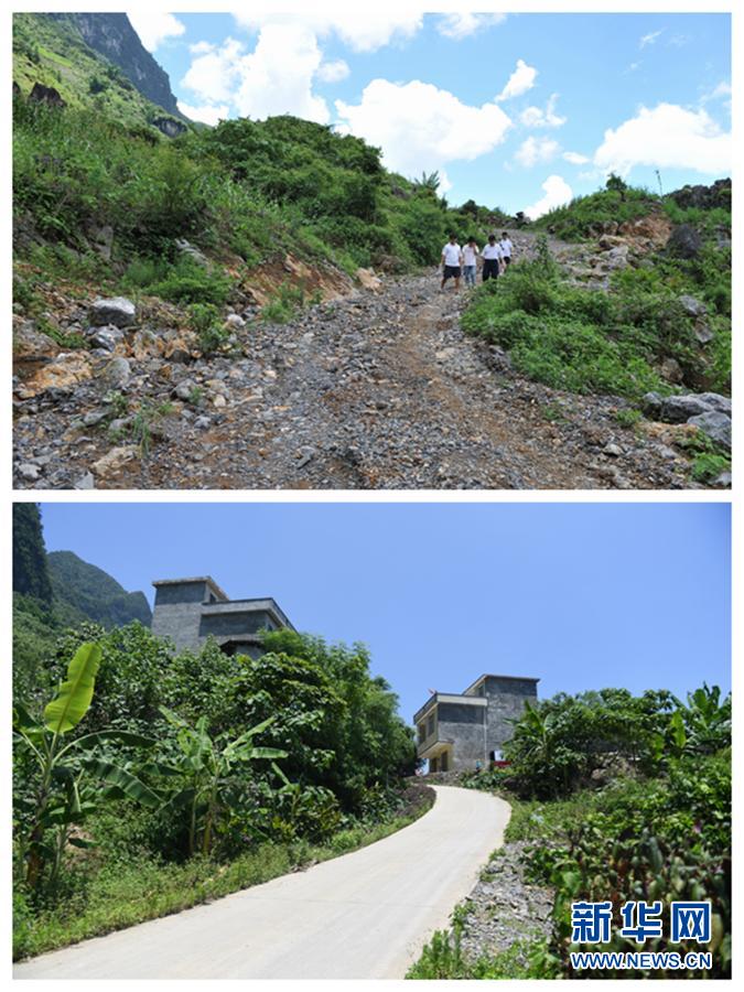 這是一張拼版照片。上圖:已經(jīng)修通水泥路的大化瑤族自治縣板升鄉(xiāng)八好村(2019年11月11日攝,無人機(jī)照片);下圖:在尚未通路前,八好村村民背著年貨走山路回家(2016年1月26日攝)。新華社記者 黃孝邦 攝