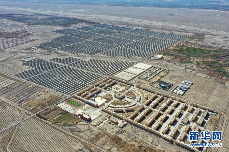 這是新疆阿克陶縣易地扶貧搬遷點的阿克陶縣現代設施農業(yè)產業(yè)扶貧基地和阿克陶縣昆侖佳苑小區(qū)(3月22日攝,無人機照片)。新華社記者 丁磊 攝