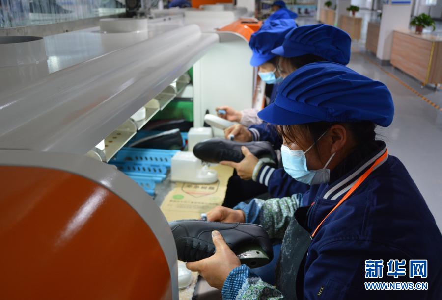 工人在廈琳鞋業(yè)產業(yè)園扶貧車間給成型鞋刷膠(12月1日攝)。新華社記者 顏之宏 攝