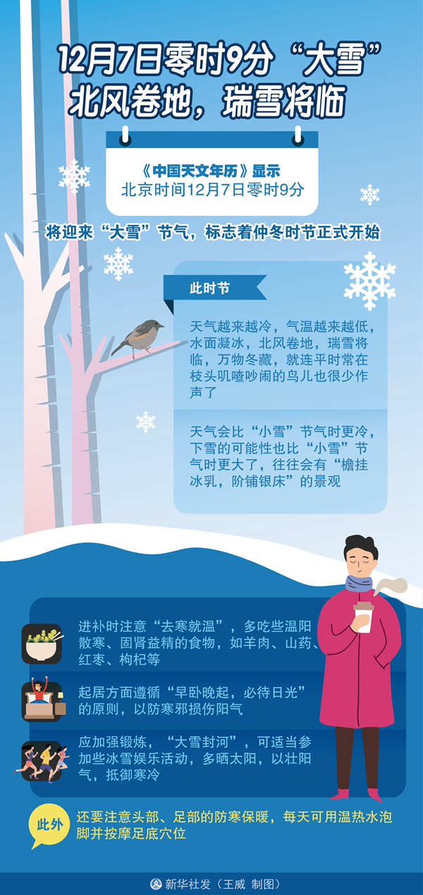 新華社天津12月5日電(記者周潤?。耙股钪┲兀瑫r(shí)聞?wù)壑衤??!薄吨袊煳哪隁v》顯示,北京時(shí)間12月7日零時(shí)9分將迎來“大雪”節(jié)氣,標(biāo)志著仲冬時(shí)節(jié)正式開始。此時(shí)節(jié),天氣越來越冷,氣溫越來越低,水面凝冰,北風(fēng)卷地,瑞雪將臨,萬物冬藏,就連平時(shí)常在枝頭嘰喳吵鬧的鳥兒也很少作聲了。